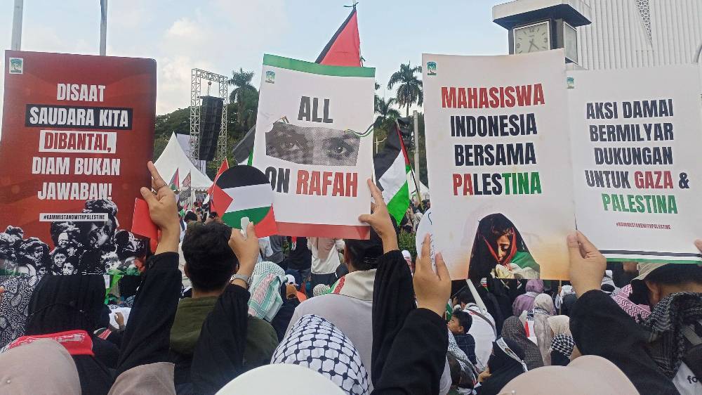 “‘Free Palestine’, ‘Free Palestine’. Allahu akbar, Allahu akbar,” teriak ribuan peserta aksi damai Palestina secara serentak di kawasan Monas.